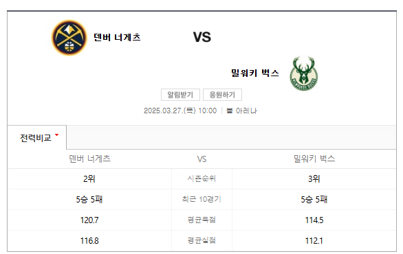 2025년 3월 27일, 덴버 너게츠와 밀워키 벅스의 경기가 열립니다. 이 경기는 NBA 정규 시즌의 중요한 일환으로, 두 팀 모두 플레이오프 진출을 위해 필사적인 상황입니다. 덴버 너게츠는 홈에서 경기를 치르며, 밀워키 벅스는 원정에서의 승리를 노리고 있습니다.