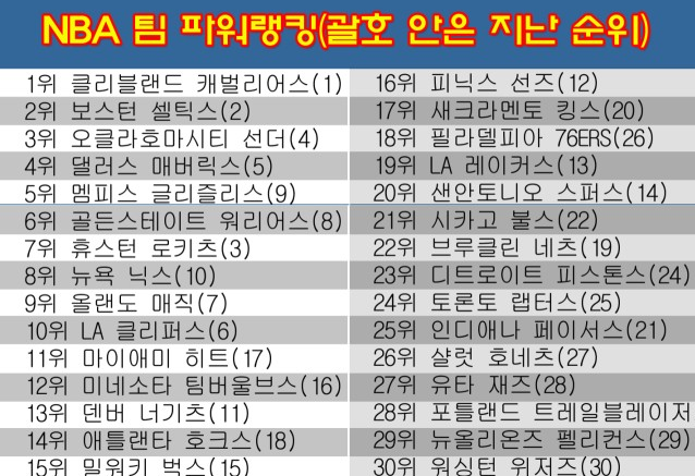 클리블랜드 캐벌리어스는 현재 NBA 파워랭킹에서 1위를 차지하고 있어요.
