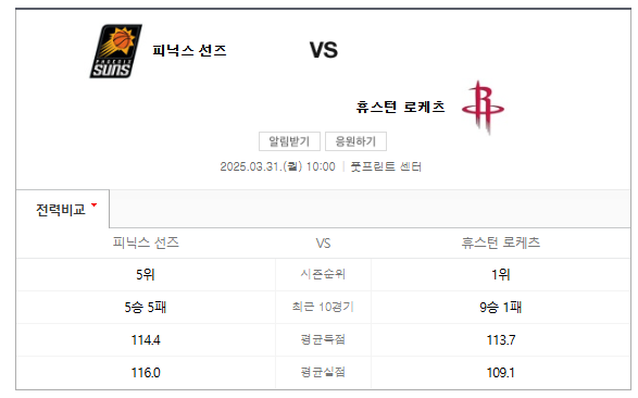 2025년 3월 31일, 피닉스 선즈와 휴스턴 로케츠의 경기가 예정되어 있습니다. 이 경기는 NBA 정규 시즌의 중요한 일환으로, 두 팀 모두 승리를 위해 최선을 다할 것입니다. 🏀