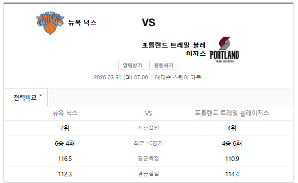 이번 경기는 2025년 3월 31일 오후 7시(현지 시간)에 시작됩니다. 뉴욕 닉스는 홈에서 경기를 치르며, 포틀랜드 트레일 블레이저즈는 원정으로 나섭니다. 두 팀 모두 최근 경기에서의 성적이 좋지 않아, 이번 경기는 더욱 치열한 경쟁이 예상됩니다.