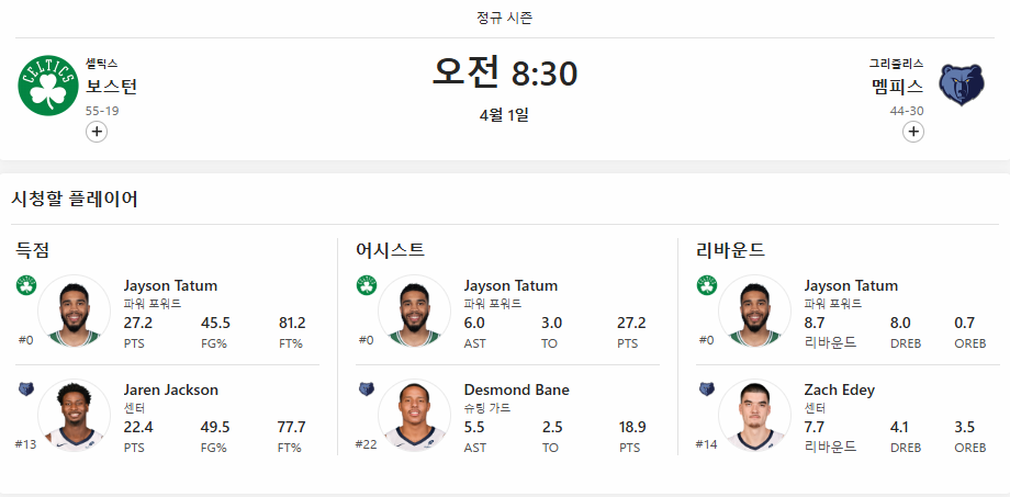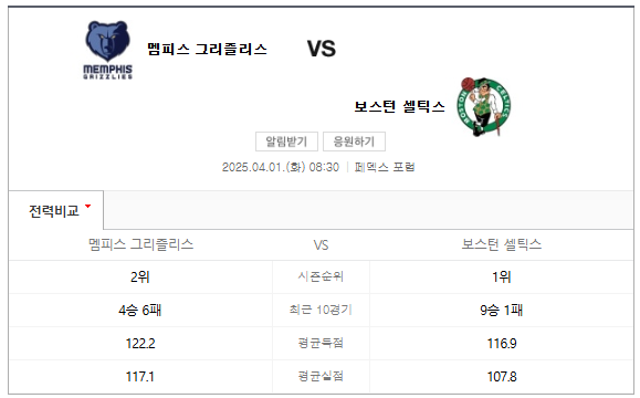 이번 경기는 두 팀의 스타일이 맞붙는 흥미로운 대결이 될 것입니다. 보스턴 셀틱스는 경험이 풍부한 선수들이 많아 경기 운영에서 우위를 점할 가능성이 높습니다. 반면, 멤피스 그리즐리스는 젊은 에너지를 바탕으로 빠른 템포의 경기를 펼칠 것으로 예상됩니다.