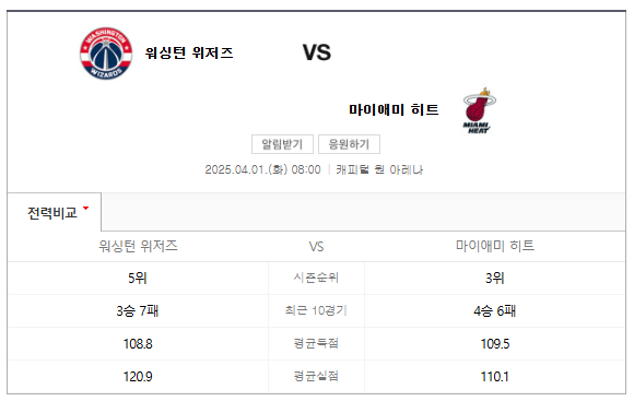 4월1일 NBA 워싱턴 위저즈 마이애미 히트 경기 분석/스포츠 분석
