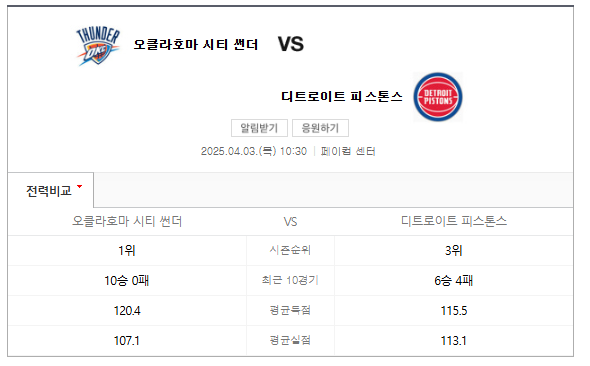 이번 경기는 두 팀의 스타일이 상반되기 때문에 예측하기가 쉽지 않습니다. 하지만 오클라호마 시티 썬더가 홈에서의 이점을 가지고 있으며, 최근 경기에서의 상승세를 고려할 때, 이길 것이라고 예상됩니다. 디트로이트 피스톤스도 강한 수비로 반격할 가능성이 있지만, 썬더의 공격력이 더 우세할 것으로 보입니다.