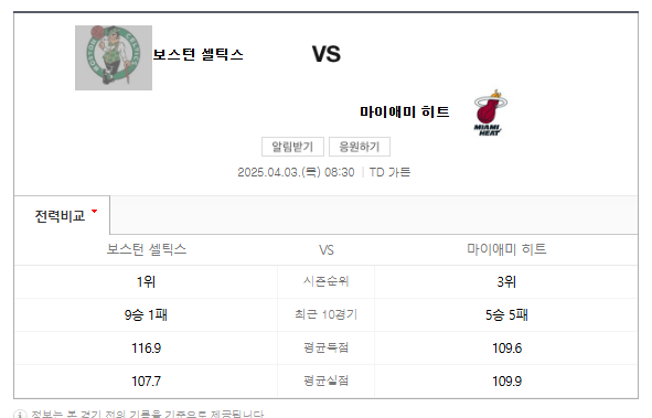 2025년 4월 3일, 보스턴 셀틱스와 마이애미 히트의 경기는  보스턴의 TD 가든에서 열리며, 팬들에게는 흥미로운 경기가 될 것입니다. 두 팀 모두 최근 좋은 성적을 내고 있어, 팬들의 기대가 큽니다.