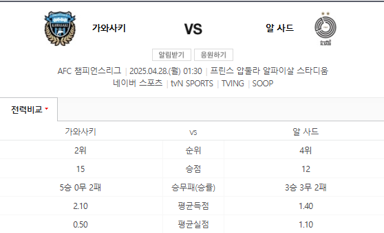 2025년 4월 28일, 가와사키 프론탈레와 알 사드가 중립 경기장에서 맞붙습니다. 이 경기는 AFC 챔피언스리그의 중요한 일전으로, 두 팀 모두 승리를 위해 최선을 다할 것입니다.