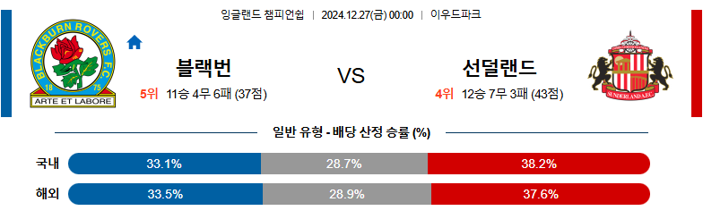 이번 경기는 매우 치열할 것으로 예상됩니다. 양 팀 모두 승리를 위해 최선을 다할 것이며, 배팅 정보에 따르면 선덜랜드의 승리 확률은 38.2%, 블랙번은 33.1%로 나타나고 있습니다. 이러한 수치는 양 팀의 현재 폼과 상대 전적을 고려했을 때 합리적인 예측으로 보입니다.