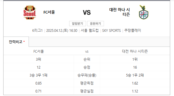 FC 서울과 대전 하나 시티즌의 경기가 2025년 4월 12일에 열립니다. 이번 경기는 K리그에서 중요한 대결로, 두 팀 모두 승리를 위해 최선을 다할 것입니다. 이번 포스팅에서는 경기 분석과 예측을 통해 팬 여러분께 유익한 정보를 제공하고자 합니다. ⚽️