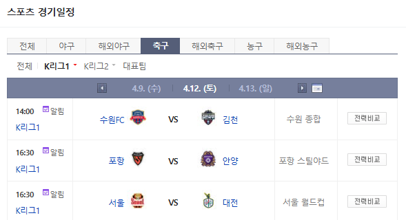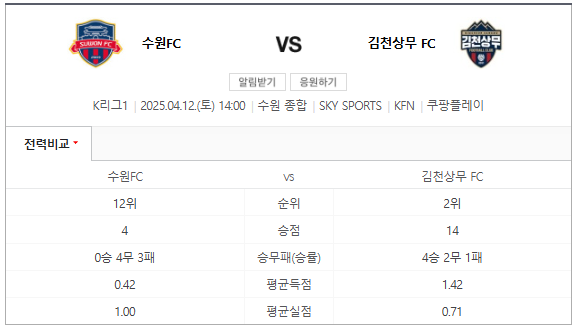 2025년 4월 12일 K리그1 수원FC 김천상무 FC/포항 안양/서울 대전 경기 분석과 경기 예측을 소개하고자 합니다.