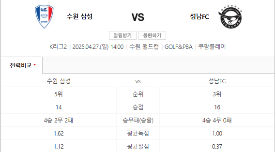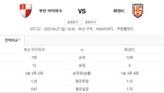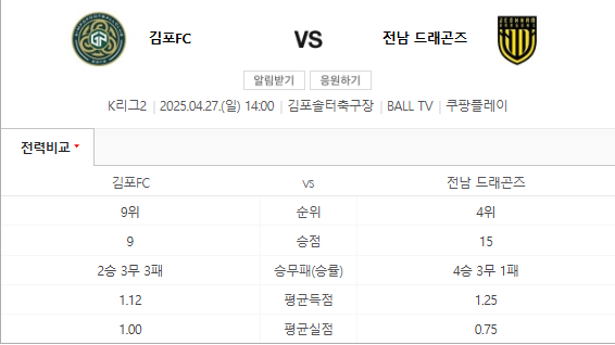 [K리그 2 경기] 2025년4월27일 김포FC 전남 드래곤즈/수원 삼성 성남FC/부산 아이파크 화성FC 경기 분석 및 경기 예측을 소개하고자 합니다.