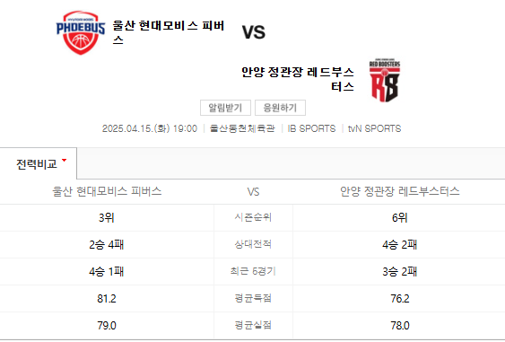 2025년 4월 15일, 울산 현대모비스와 안양 정관장이 KBL 센터에서 맞붙습니다. 울산 현대모비스는 현재 리그에서 2위에 위치하고 있으며, 21승 12패의 성적을 기록하고 있습니다. 반면, 안양 정관장은 9위로 11승 23패의 성적을 보이고 있습니다. 이 경기는 두 팀의 전력 차이가 뚜렷하게 드러나는 경기로 예상됩니다.