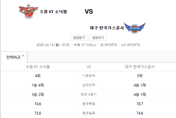 수원 KT 소닉붐은 정규 시즌에서 33승 21패로 4위를 기록하며 플레이오프에 진출했습니다. 반면 대구 한국가스공사는 5위로, 두 팀의 성적 차이는 크지 않습니다. 최근 맞대결에서 수원 KT는 대구에게 68-80으로 패배한 경험이 있어, 이번 경기는 반드시 승리해야 할 경기입니다.