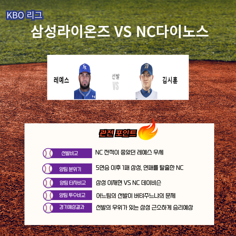 이번 경기는 매우 팽팽한 경기가 예상됩니다. 양 팀 모두 강력한 선발 투수를 보유하고 있으며, 타선의 집중력과 수비력도 중요할 것입니다. 개인적으로는 NC 다이노스가 최근의 상승세를 이어가며 승리할 가능성이 높다고 생각합니다. 하지만 삼성 라이온즈의 반격도 만만치 않을 것이므로, 경기 결과는 끝까지 긴장감을 유지할 것으로 예상합니다.