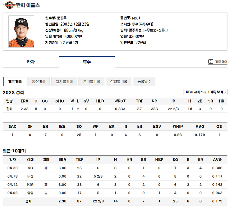 한화 이글스의 문동주 선수는 최근 뛰어난 성적을 보여주고 있습니다. 그의 2023 시즌 성적은 ERA 2.38, 4경기에서 25개의 탈삼진을 기록하며 팀의 중요한 투수로 자리 잡고 있습니다.