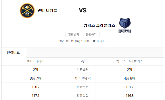 이번 경기는 덴버의 홈구장인 볼 아레나에서 열리며, 한국 시간으로 2025년 4월 12일 오전 10시에 시작됩니다. 두 팀 모두 플레이오프 진출을 위해 필사적인 상황에 놓여 있습니다. 덴버는 최근 4연패에 빠져 있으며, 멤피스는 8위로 순위가 위태로운 상황입니다. 이러한 배경 속에서 두 팀의 맞대결은 더욱 흥미로울 것입니다.