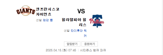 이번 경기는 자이언츠의 홈에서 열리기 때문에, 자이언츠가 유리할 것으로 예상됩니다. 자이언츠의 투수진이 필리스의 타선을 잘 막아낸다면, 자이언츠의 승리가 예상됩니다. 하지만 필리스의 공격력이 만만치 않기 때문에, 자이언츠가 방심해서는 안 될 것입니다.