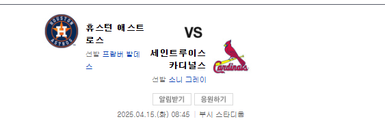 2025년 4월 15일, 휴스턴 애스트로스와 세인트루이스 카디널스의 경기가 열립니다. 이 경기는 메이저리그에서 두 팀의 치열한 경쟁을 보여줄 중요한 경기입니다. 양 팀 모두 팬들의 기대를 한 몸에 받고 있으며, 이번 경기는 많은 이들의 관심을 끌 것으로 예상됩니다.