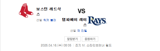 2025년 4월 16일, 보스턴 레드삭스와 탬파베이 레이스의 경기가 열립니다. 이 경기는 MLB 정규 시즌의 중요한 일환으로, 두 팀 모두 승리를 위해 최선을 다할 것입니다. 보스턴 레드삭스는 홈구장에서 경기를 치르며, 탬파베이 레이스는 원정팀으로서 도전장을 내밀게 됩니다.