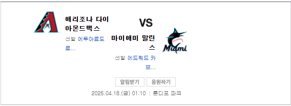 2025년 4월 18일, 애리조나 다이아몬드백스와 마이애미 말린스의 경기는 애리조나의 홈구장인 체이스 필드에서 열립니다. 두 팀 모두 이번 시즌 좋은 성적을 내고 있어 팬들의 기대가 큽니다. 애리조나 다이아몬드백스는 최근 몇 년간 꾸준한 성장을 보여주었고, 마이애미 말린스는 젊은 선수들이 두각을 나타내고 있습니다.