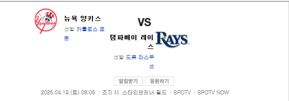 2025년 4월 19일, 뉴욕 양키스와 탬파베이 레이스의 경기는 뉴욕 양키스의 홈구장인 양키 스타디움에서 열립니다. 이 경기는 메이저리그 시즌 초반의 중요한 대결 중 하나로 평가받고 있으며, 두 팀 모두 승리를 위해 최선을 다할 것입니다.