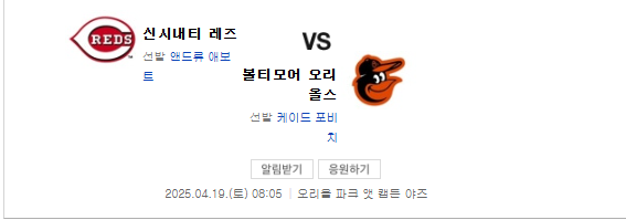 2025년 4월 19일, 볼티모어 오리올스가 홈구장인 캠든 야즈에서 신시내티 레즈를 맞이합니다. 양 팀의 현재 성적과 시즌 초반의 흐름을 살펴보겠습니다. 볼티모어 오리올스는 홈에서의 강세를 보이고 있으며, 신시내티 레즈는 원정에서의 경기력이 다소 불안정한 모습을 보이고 있습니다.