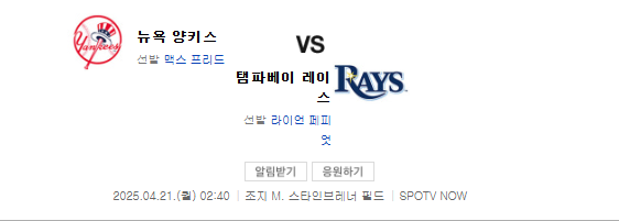 2025년4월21일 뉴욕 양키스 탬파베이 레이스/ 캔자스시티 로열스 디트로이트 타이거즈/ 세인트루이스 카디널스 뉴욕 메츠 경기 분석 및 경기 예측을 소개하고자 합니다.