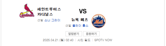 2025년 4월 21일, 뉴욕 시티필드에서 열리는 이 경기는 두 팀의 시즌 중 중요한 순간이 될 것입니다. 세인트루이스 카디널스는 전통적으로 강한 팀으로 알려져 있으며, 뉴욕 메츠는 최근 몇 년간 상승세를 타고 있습니다. 두 팀의 맞대결은 항상 흥미로운 요소가 많습니다.
