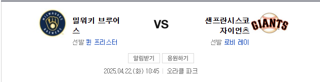 2025년 4월 22일, 밀워키 브루어스와 샌프란시스코 자이언츠의 경기는 밀워키의 홈구장인 밀러 파크에서 열릴 예정입니다. 경기는 오후 7시 10분에 시작되며, 많은 팬들이 이 경기를 기다리고 있습니다.