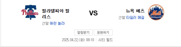 이번 경기는 미국 뉴욕 플러싱의 시티 필드에서 열리며, 오전 08:10 KST에 시작됩니다. 두 팀 모두 현재 시즌에서 좋은 성적을 내고 있어, 팬들에게 흥미로운 경기가 될 것으로 예상합니다. 필리스는 최근 경기에서 강력한 타선을 보여주었고, 메츠는 안정적인 불펜 운영으로 주목받고 있습니다.