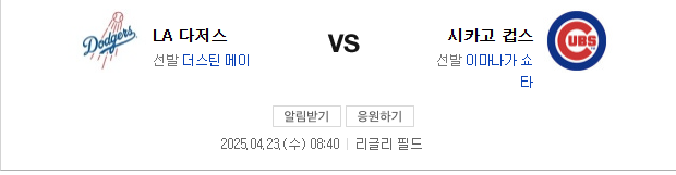 경기는 4월 23일 오전 11시 10분에 시작됩니다. 현재 LA 다저스는 86승 57패로 리그에서 좋은 성적을 기록하고 있으며, 시카고 컵스는 73승 70패로 중위권에 위치하고 있습니다. 다저스는 최근 몇 경기에서 좋은 흐름을 이어가고 있으며, 컵스는 다소 부진한 모습을 보이고 있습니다.