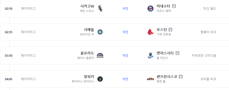 2025년4월25일 시카고 화이트삭스 미네소타 트윈스/ 시애틀 매리너스 보스턴 레드삭스/콜로라도 로키스 캔자스시티 로열스/밀워키 브루어스 샌프란시스코 자이언츠 경기 분석 및 경기 예측을 소개하고자 합니다.