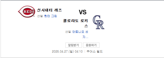 2025년 4월 27일, 신시내티 레즈와 콜로라도 로키스의 경기가 신시내티의 홈구장에서 열립니다. 두 팀 모두 이번 시즌에서 중요한 경기를 치르고 있으며, 팬들의 기대가 큽니다. 특히, 신시내티 레즈는 홈에서의 강한 성적을 자랑하고 있어, 이번 경기에 대한 기대감이 더욱 높습니다.