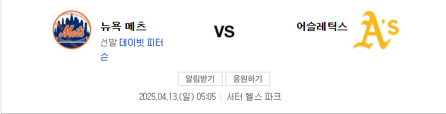 2025년 4월 13일, 뉴욕 메츠와 어슬레틱스의 경기가 열립니다. 메츠는 강력한 타선과 안정적인 투수진을 보유하고 있으며, 어슬레틱스는 새로운 구장에서의 출발을 알리는 중요한 경기를 치르게 됩니다. 이 경기는 양 팀 모두에게 중요한 의미를 지니고 있습니다.