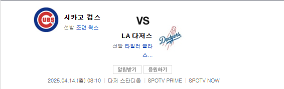 2025년 4월 14일, 시카고 컵스와 LA 다저스의 경기가 열립니다. 이 경기는 두 팀 모두에게 중요한 의미를 지니고 있으며, 특히 시즌 초반의 성적이 향후 경기력에 큰 영향을 미칠 수 있습니다. 두 팀의 팬들은 이번 경기를 통해 팀의 현재 상태를 확인할 수 있는 좋은 기회가 될 것입니다.