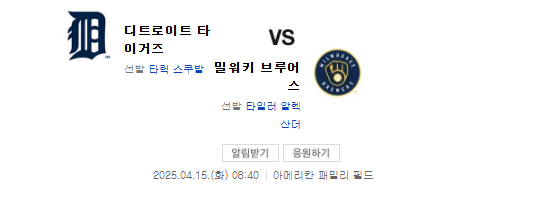 2025년 4월 15일, 디트로이트 타이거즈와 밀워키 브루어스의 경기는 MLB 정규 시즌의 중요한 일전으로, 두 팀 모두 승리를 위해 최선을 다할 것입니다. 디트로이트 타이거즈는 홈에서 경기를 치르며, 밀워키 브루어스는 원정팀으로서의 도전을 맞이합니다. 이 경기는 두 팀의 현재 성적과 선수들의 컨디션에 따라 흥미로운 결과를 가져올 것으로 예상됩니다.