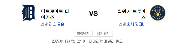 2025년4월17일 디트로이트 타이거즈 밀워키 브루어스/휴스턴 애스트로스 세인트루이스 카디널스 경기 분석 및 경기 예측을 소개하고자 합니다.