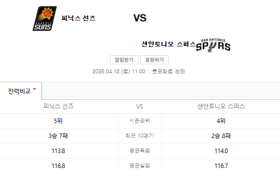 2025년 4월 12일, 피닉스 선즈와 샌안토니오 스퍼스의 경기가 열립니다. 이 경기는 NBA 정규 시즌의 중요한 일환으로, 두 팀 모두 플레이오프 진출을 위해 필사적인 상황입니다. 팬들은 이 경기를 통해 두 팀의 실력을 비교하고, 어떤 팀이 더 나은 성적을 낼지 기대하고 있습니다.
