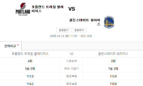 2025년 4월 12일, 포틀랜드 트레일 블레이저스와 골든 스테이트 워리어스의 경기가 열립니다. 이 경기는 NBA 정규 시즌의 중요한 일환으로, 두 팀 모두 플레이오프 진출을 위해 필사적으로 싸울 것입니다. 포틀랜드는 최근 몇 경기에서 좋은 성적을 내고 있으며, 골든 스테이트는 전통적인 강팀으로서의 면모를 보여주고 있습니다.