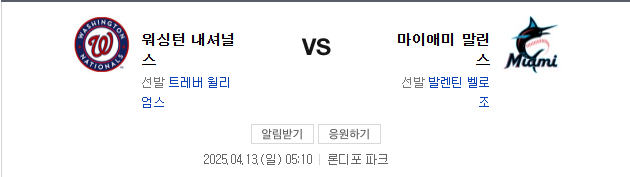 2025년 4월 13일, 워싱턴 내셔널스와 마이애미 말린스의 경기가 예정되어 있습니다. 이 경기는 MLB 정규 시즌의 중요한 일환으로, 두 팀 모두 승리를 위해 최선을 다할 것입니다. 특히, 두 팀의 최근 성적과 선수들의 컨디션이 경기 결과에 큰 영향을 미칠 것으로 예상됩니다.