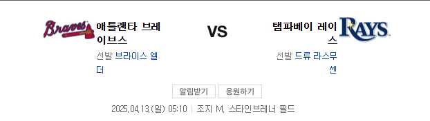 2025년 4월 13일, 애틀랜타의 트루이스트 파크에서 애틀랜타 브레이브스와 탬파베이 레이스의 경기가 펼쳐집니다. 두 팀 모두 메이저리그에서 강력한 팀으로 자리 잡고 있으며, 이번 경기는 팬들에게 큰 기대를 모으고 있습니다.