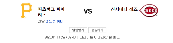 2025년 4월 13일, 피츠버그 파이리츠와 신시내티 레즈가 맞붙습니다. 이번 경기는 메이저 리그 베이스볼(MLB) 시즌의 중요한 한 경기가 될 것입니다. 두 팀 모두 각자의 목표를 가지고 시즌을 치르고 있는 만큼, 이 경기는 팬들과 전문가들의 많은 관심을 받을 것으로 예상됩니다.