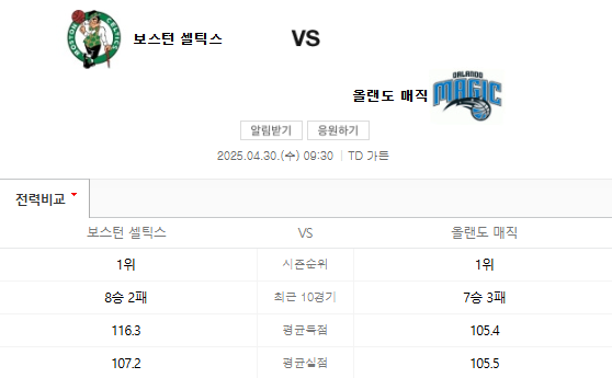 2025년 4월 30일, 보스턴 셀틱스는 올랜도 매직을 홈구장인 TD 가든에서 맞이합니다. 두 팀 모두 최근 몇 경기에서 치열한 경쟁을 펼치고 있으며, 이번 경기는 그들의 성적에 큰 영향을 미칠 것으로 예상됩니다.