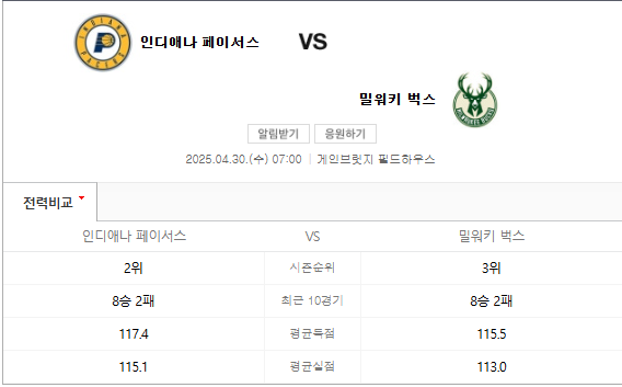 2025년 4월 30일, 인디애나 페이서스와 밀워키 벅스의 경기가 열립니다. 이 경기는 NBA 플레이오프의 중요한 일환으로, 두 팀 모두 다음 라운드 진출을 위해 필사적으로 싸울 것입니다. 현재 페이서스가 시리즈를 2-1로 이끌고 있으며, 벅스는 반격을 위해 최선을 다할 것입니다.