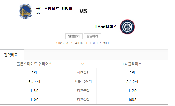 2025년 4월 14일, 골든스테이트 워리어스와 LA 클리퍼스의 경기가 열립니다. 이 경기는 NBA 정규 시즌의 중요한 일환으로, 두 팀 모두 플레이오프 진출을 위해 필사적으로 싸우고 있습니다. 특히, 두 팀의 맞대결은 항상 치열한 경쟁을 보여주며, 팬들에게 큰 기대를 모으고 있습니다.