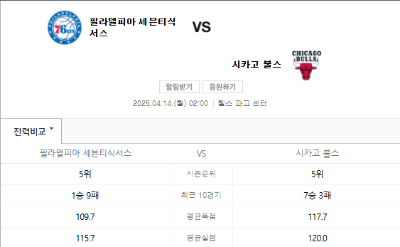 2025년 4월 14일, 필라델피아의 웰스 파고 센터에서 열리는 이 경기는 NBA 정규 시즌의 중요한 일전입니다. 두 팀 모두 현재 성적이 좋지 않지만, 이번 경기를 통해 반전을 노리고 있습니다. 필라델피아 세븐티식서스는 홈에서의 강점을 살려 승리를 목표로 하고 있으며, 시카고 불스는 원정에서의 기세를 이어가고자 합니다.