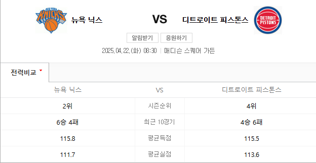 이번 경기는 뉴욕 닉스와 디트로이트 피스톤스 간의 대결로, 두 팀 모두 최근의 경기에서 좋은 성적을 내고 있습니다. 특히, 닉스는 홈에서의 강세를 보이고 있으며, 피스톤스는 원정에서도 저력을 발휘하고 있습니다.