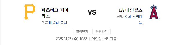 이번 경기는 피츠버그의 홈구장인 PNC 파크에서 열리며, 양 팀 모두 시즌 초반의 중요한 경기를 치르게 됩니다. 피츠버그 파이리츠는 최근 몇 년간의 부진을 딛고 다시 한 번 포스트시즌 진출을 노리고 있으며, LA 에인절스는 스타 선수들의 활약으로 강력한 팀으로 자리 잡고 있습니다.