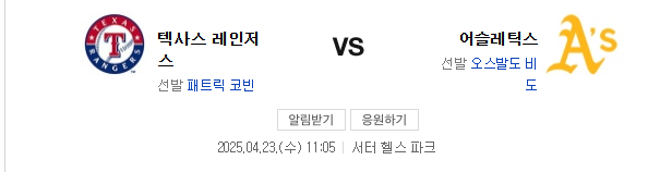 이번 경기는 텍사스 레인저스의 홈구장인 글로브 라이프 필드에서 열리며, 어슬레틱스와의 맞대결은 항상 흥미로운 요소가 많습니다. 두 팀 모두 시즌 초반부터 치열한 경쟁을 벌이고 있으며, 이번 경기가 그들의 성적에 큰 영향을 미칠 것으로 예상됩니다.