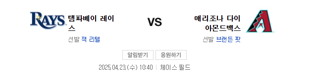 이번 경기는 2025년 4월 23일 오후 6시 40분에 시작됩니다. 두 팀의 최근 성적과 선수들의 컨디션을 고려할 때, 흥미로운 경기가 될 것으로 예상됩니다. 탬파베이 레이스는 강력한 타선과 안정적인 투수진을 자랑하며, 애리조나 다이아몬드백스는 젊은 선수들의 활약이 돋보이는 팀입니다.