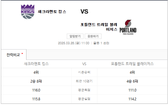 이번 경기는 매우 치열할 것으로 예상됩니다. 두 팀 모두 최근 좋은 성적을 거두고 있으며, 특히 포틀랜드 트레일 블레이저스는 최근 5경기에서 4승 1패를 기록하고 있습니다. 따라서, 포틀랜드가 이길 것이라고 예상됩니다. 하지만, 새크라멘토 킹스의 홈경기라는 점에서 변수가 있을 수 있습니다.