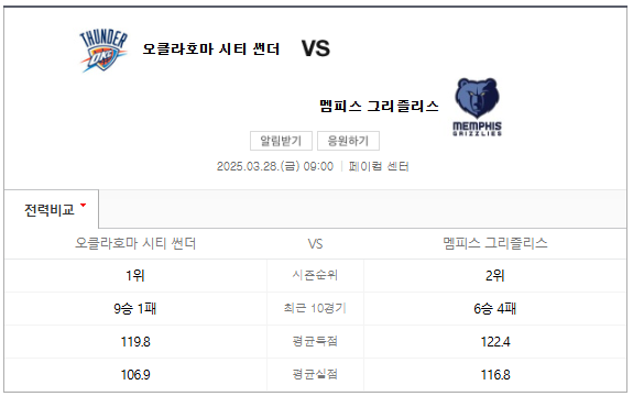 NBA 3월28일 오클라호마 시티 썬더 멤피스 그리즐리스 경기 분석/경기 예측
